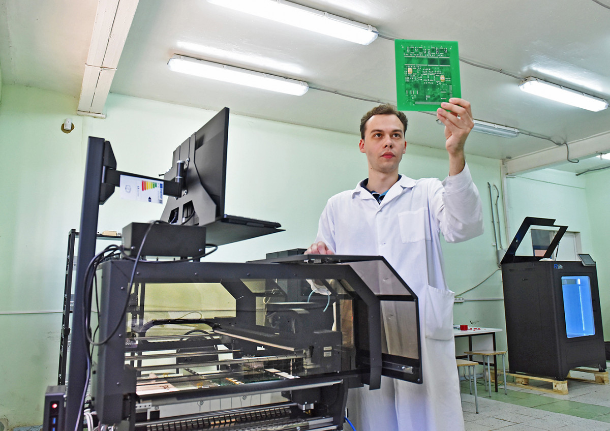 «Оборудование предназначено для автоматического нанесения припойной пасты на контактные площадки и установки электрорадиоизделий (ЭРИ) на плату, — прокомментировал ведущий инженер-электроник Олег Рудаков. — Установщик специально спроектирован для опытного производства и малых серий, ведет двусторонний монтаж компонентов на плату. В комплекте имеются две камеры со встроенной подсветкой, которые обеспечивают выравнивание ЭРИ, взятых из лотка, в случае, если они лежат под углом или неровно».