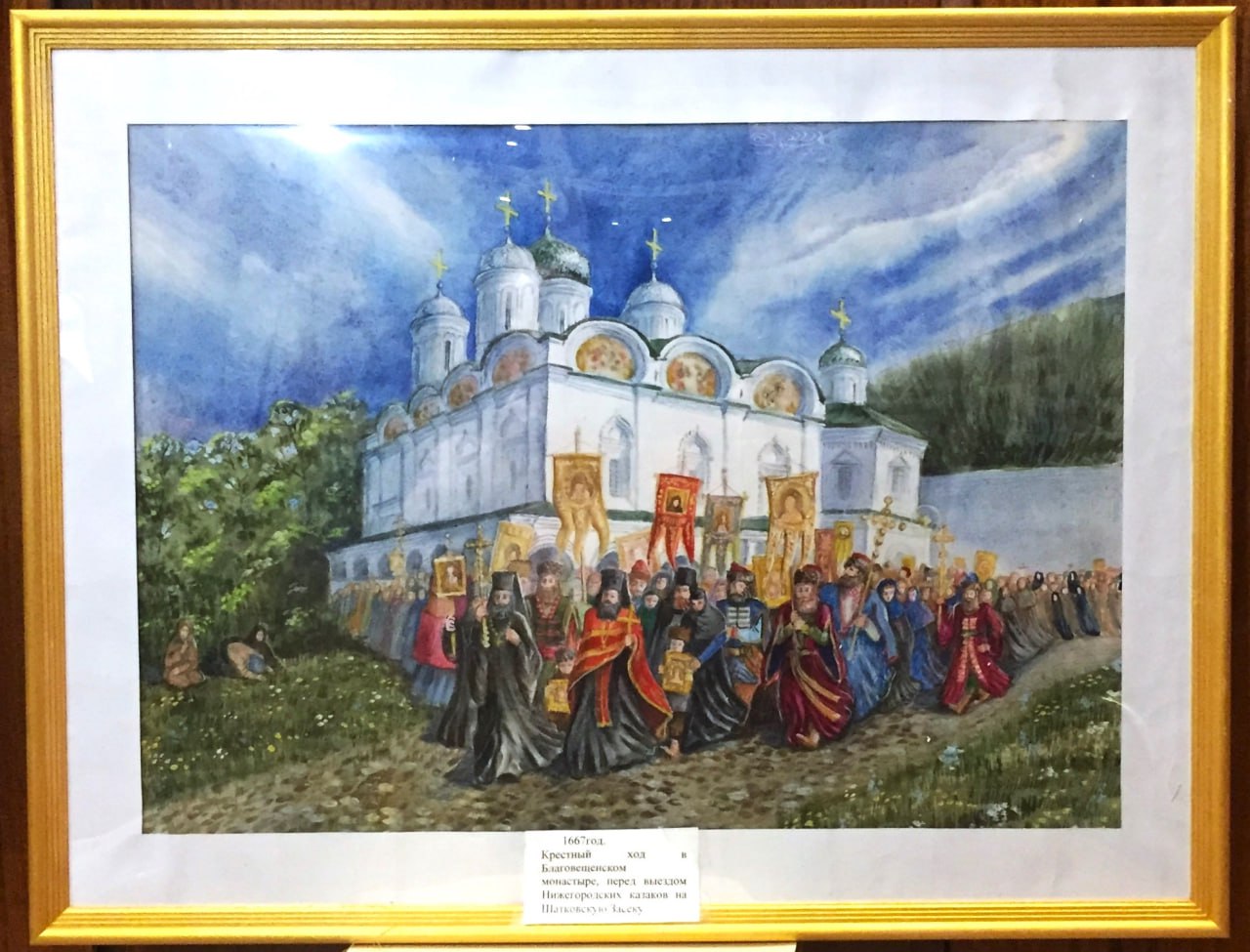 — Возьмем картину «Крестный ход при выходе казаков на засеку». На ней представлен выход казаков за пределы Благовещенского монастыря, на улицу Рождественскую. Благовещенский собор хорошо изображает все оттенки того времени.