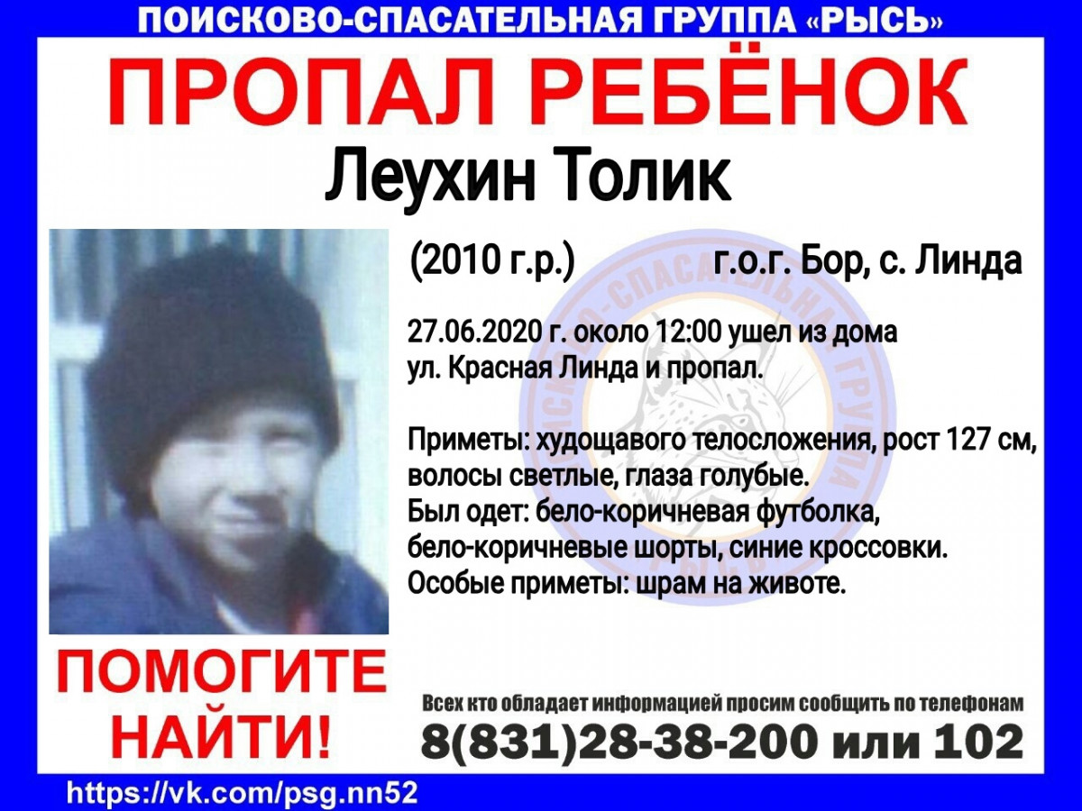 Волонтеры просят помощи в поисках 10-летнего Толика Леухина, пропавшего в городском округе Бор 27 июня, сообщает ПСЦ «Рысь».