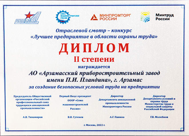 АО «Арзамасский приборостроительный завод имени П.И. Пландина» заняло второе место в отраслевом смотре-конкурсе «Лучшее предприятие в области охраны труда» за создание безопасных условий труда по итогам работы за 2021 год.