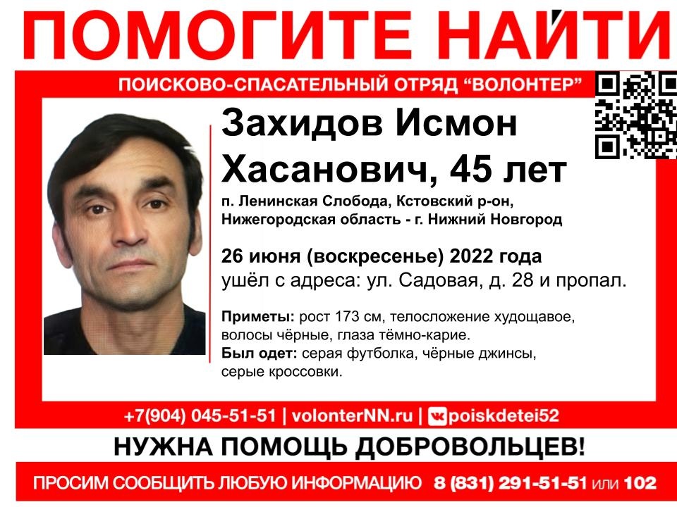 В Кстовсокм районе Нижегородской области пропал 45-летний Исмон Захидов. Как сообщает поисково-спасательный отряд «Волонтер», 26 июня, в воскресенье, мужчина ушел из дома №28 по улице Садовой в поселке Ленинская Слобода, после чего пропал и не выходил на связь.
