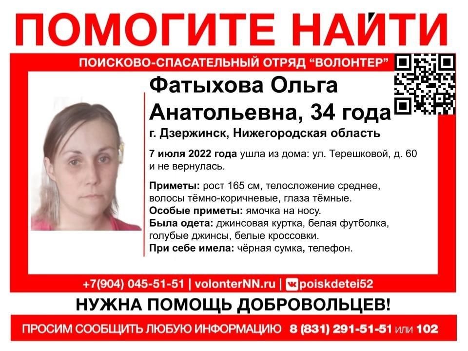34-летняя Ольга Фатыхова пропала в Дзержинске. Как сообщает поисково-спасательный отряд «Волонтер», 7 июля женщина ушла из дома по улице Терешковой, но обратно не вернулась и на связь не выходила.