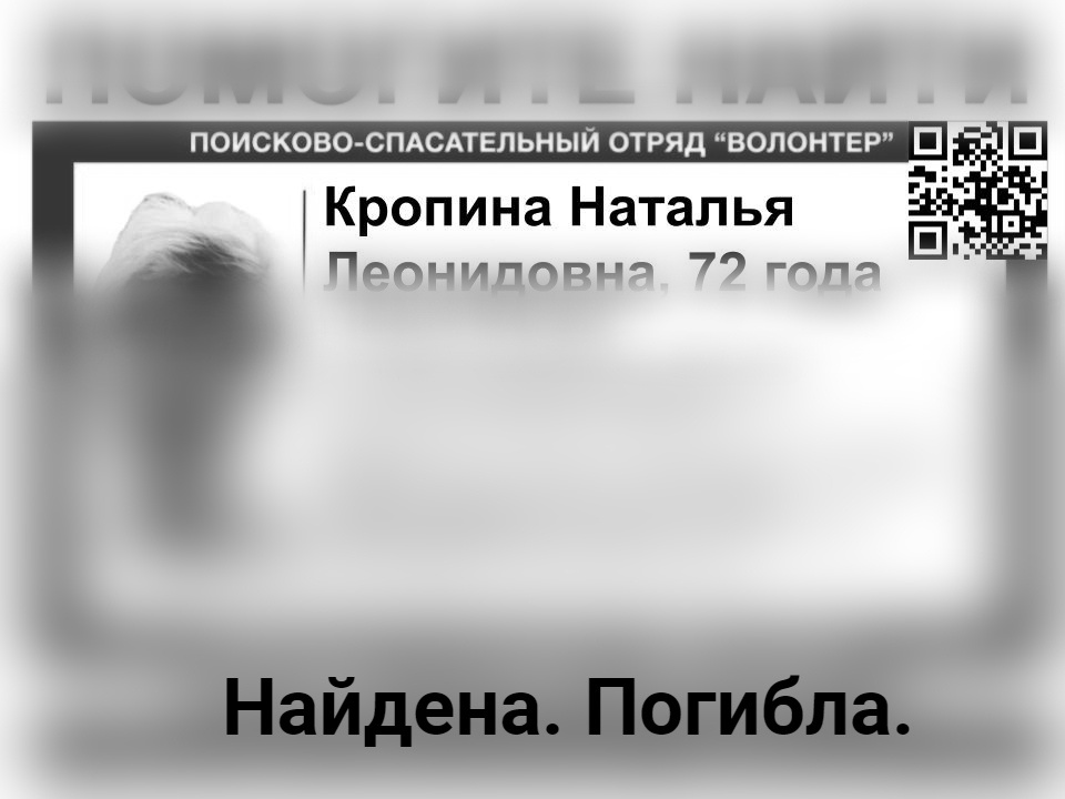 72-летняя Наталья Кропина, пропавшая в Нижнем Новгороде, найдена погибшей, сообщается на странице ПСО «Волонтер НН».