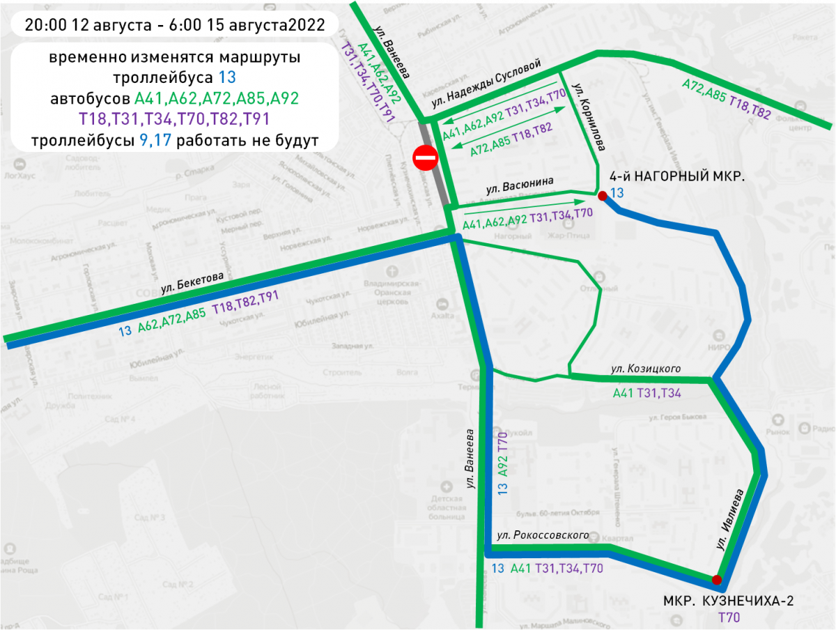 Автобусы А-41, А-62, а также Т-31, Т-34, Т-70 и Т-91 при движении в сторону площади Свободы будут двигаться по улицам Васюнина, Корнилова, Надежды Сусловой, а в направлении площади Советской — по дороге-дублеру Ванеева. Автобусы А-72, А-85, а также Т-18 и Т-82 в оба направления также поедут по дублеру Ванеева.