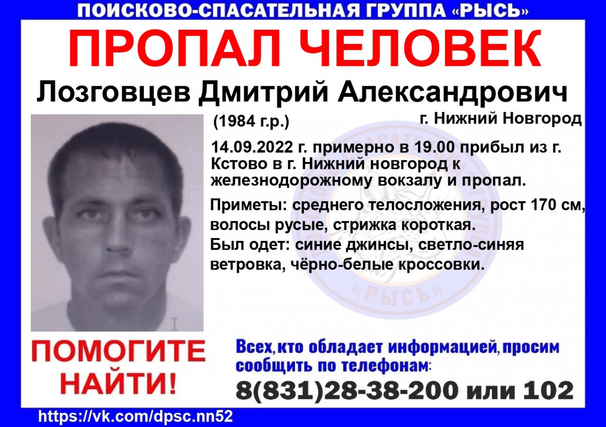 38-летнего Дмитрия Лозговцева ищут в Нижнем Новгороде, об этом сообщается в группе ПСЦ «Рысь».