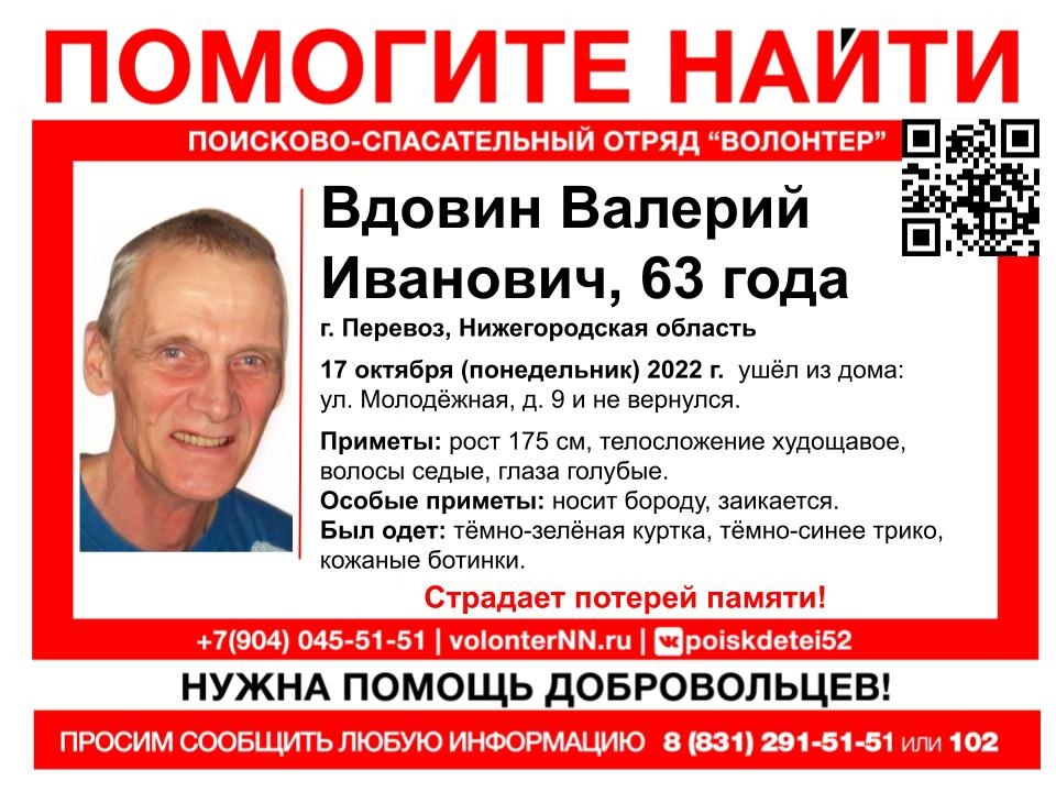 Всех, кто обладает информацией о местонахождении Валерия Вдовина, просят позвонить на горячую линию отряда ПСО «Волонтер»: 8 (831) 291 51 51 или обратиться в полицию по каналу связи 102.