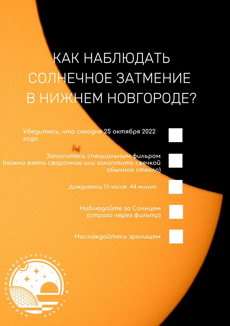 «Одно из лучших мест для наблюдения — крыша Нижегородского планетария им. Г.М. Гречко. Там гостей будут ждать астрономы и физики, чтобы рассказать об этом явлении и точно указать на время „первого касания“ и максимальной фазы затмения. Мероприятия начнутся в 12:30 — в момент начала затмения. Далее, в режиме нон-стоп на крыше и в залах планетария, будут проходить научные лекции, демонстрации и наблюдения», — сообщили специалисты департамента.