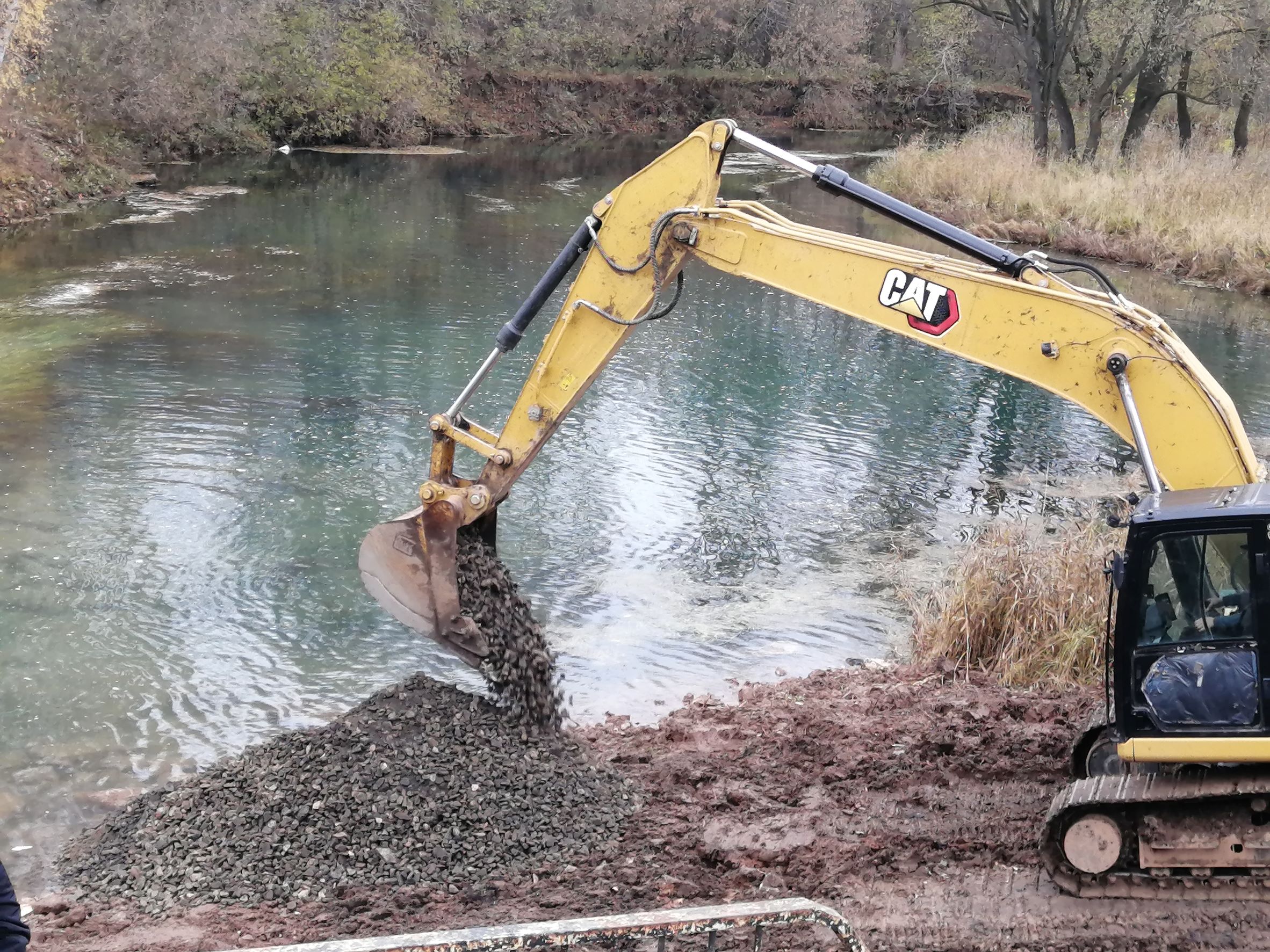 В настоящий момент подрядчик проводит подготовительные работы на объекте. Он демонтирует настил на переходных мостах и устанавливает ограждения. Подводные конструкции обследуют водолазы. Также предстоит армирование и бетонирование устоев нижнего бьефа левой и правой сторон земляной плотины.