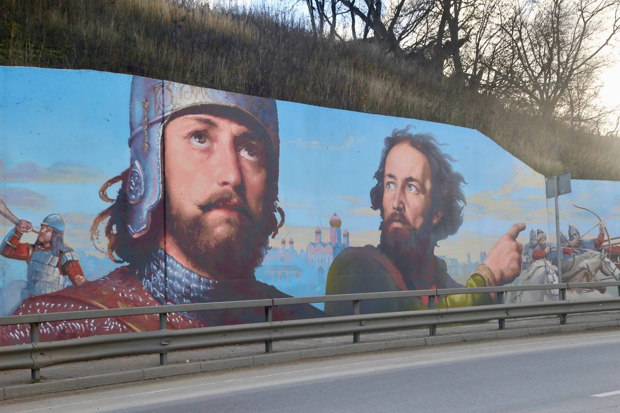 «На самом граффити изображены основные вехи жизни и развития нашего города. На центральной опоре метромоста можно увидеть Минина и Пожарского во время ополчения 1612 года и Нижегородский кремль. Справа изображены горьковчане, героически помогавшие фронту на заводе во время Великой Отечественной Войны. И слева — современный Нижний с видом на стадион и Стрелку», — рассказал Шалабаев.