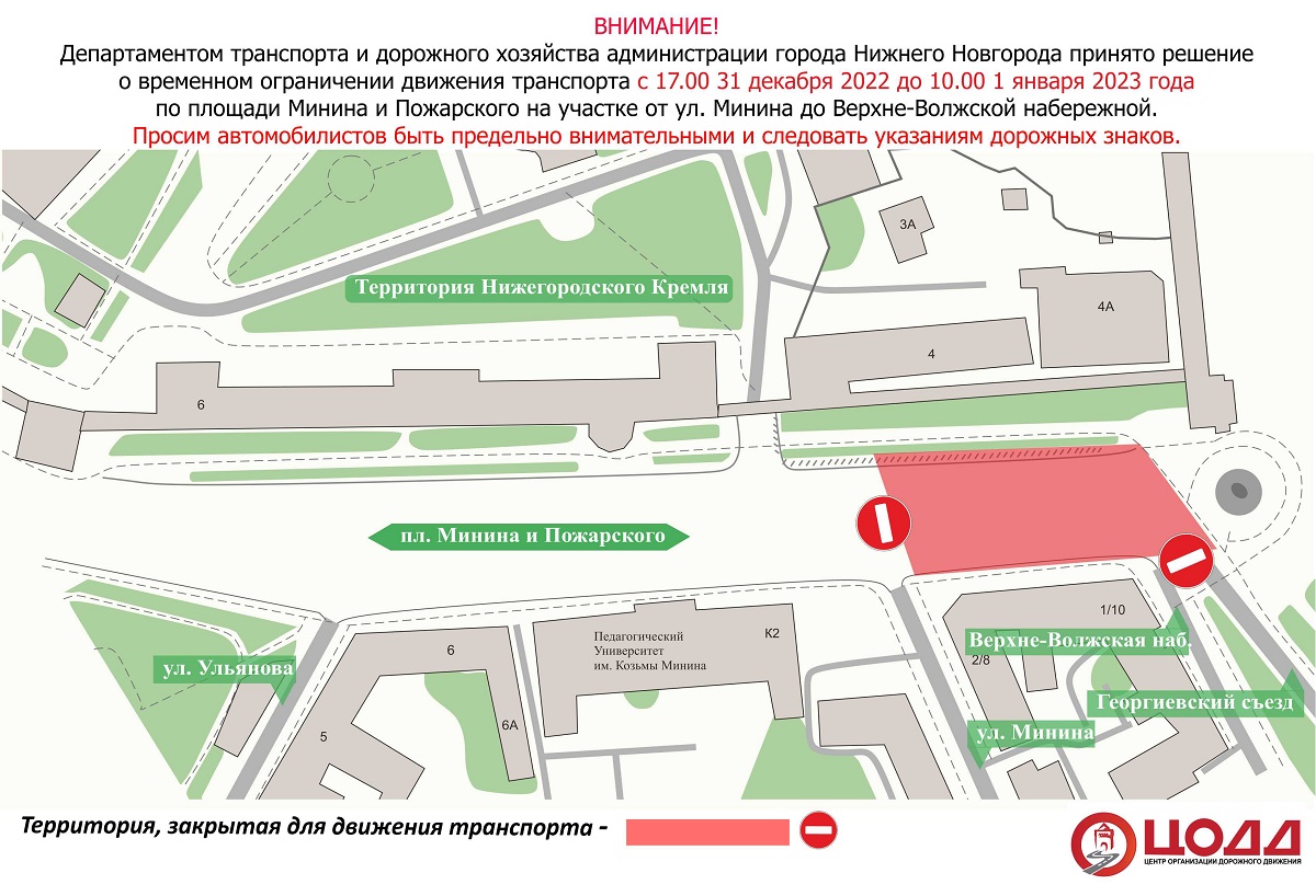 Движение транспорта на участке площади Минина и Пожарского в Нижнем Новгороде будет приостановлено с 17:00 31 декабря до 10:00 1 января, сообщили в департаменте транспорта и дорожного хозяйства администрации Нижнего Новгорода.