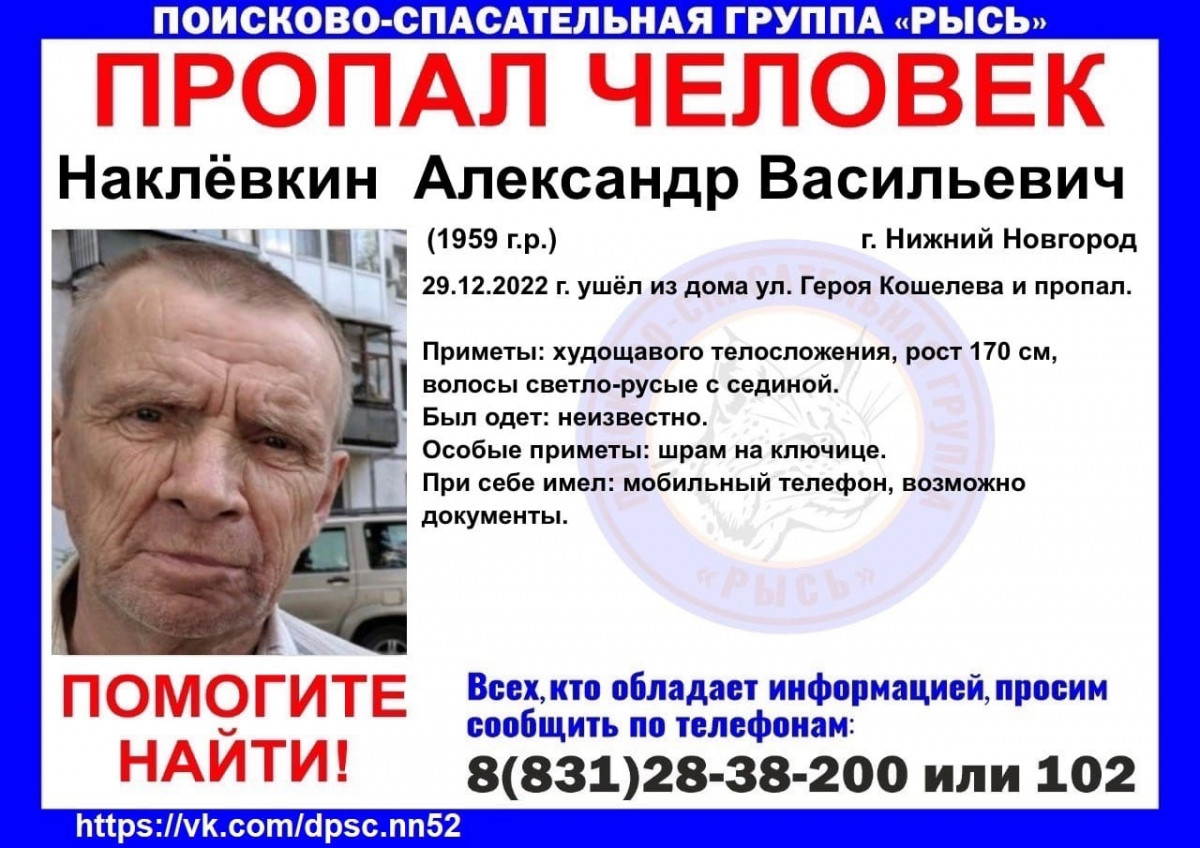 63-летний Александр Наклёвкин пропал в Нижнем Новгороде, сообщает ПСЦ «Рысь».