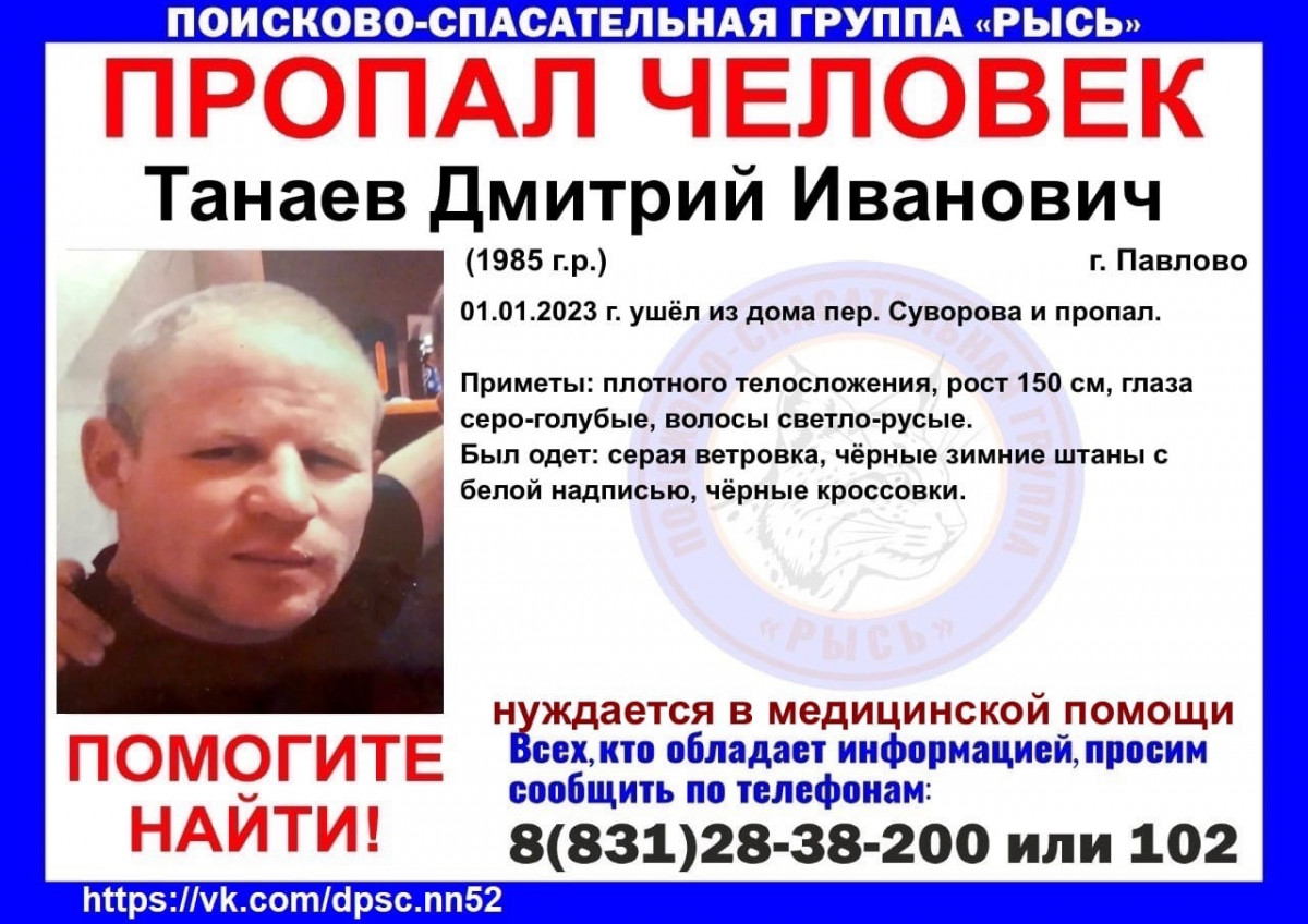 37-летний Дмитрий Танаев пропал в Павлове, об этом сообщается в группе ПСЦ «Рысь».