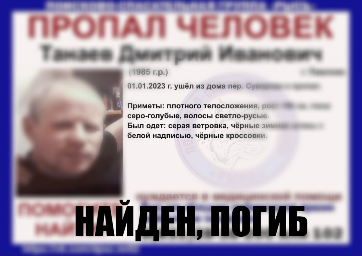 37-летний Дмитрий Танаев, которого разыскивали в Павлове Нижегородской области, найден погибшим. Об этом сообщает поисковая группа «Рысь».