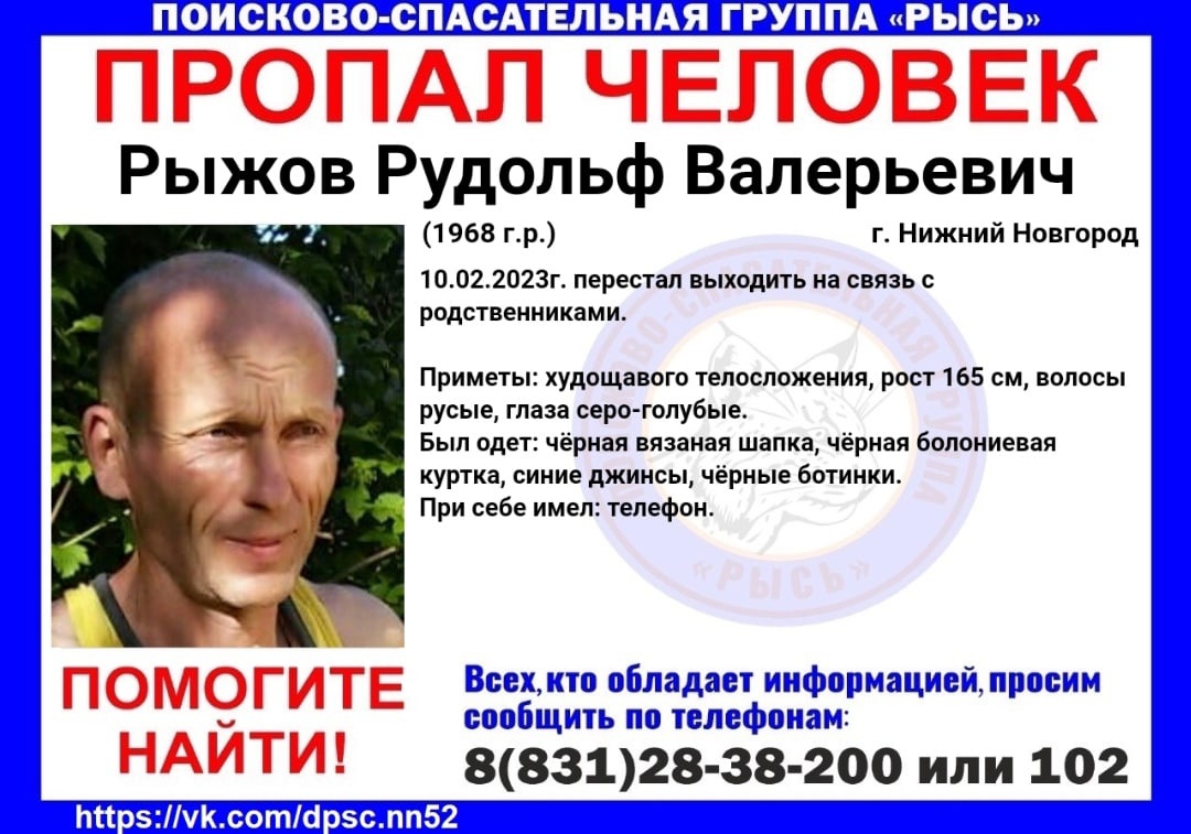54-летний Рудольф Рыжов пропал в Нижнем Новгороде, сообщается на странице ПСЦ «Рысь» во «ВКонтакте».