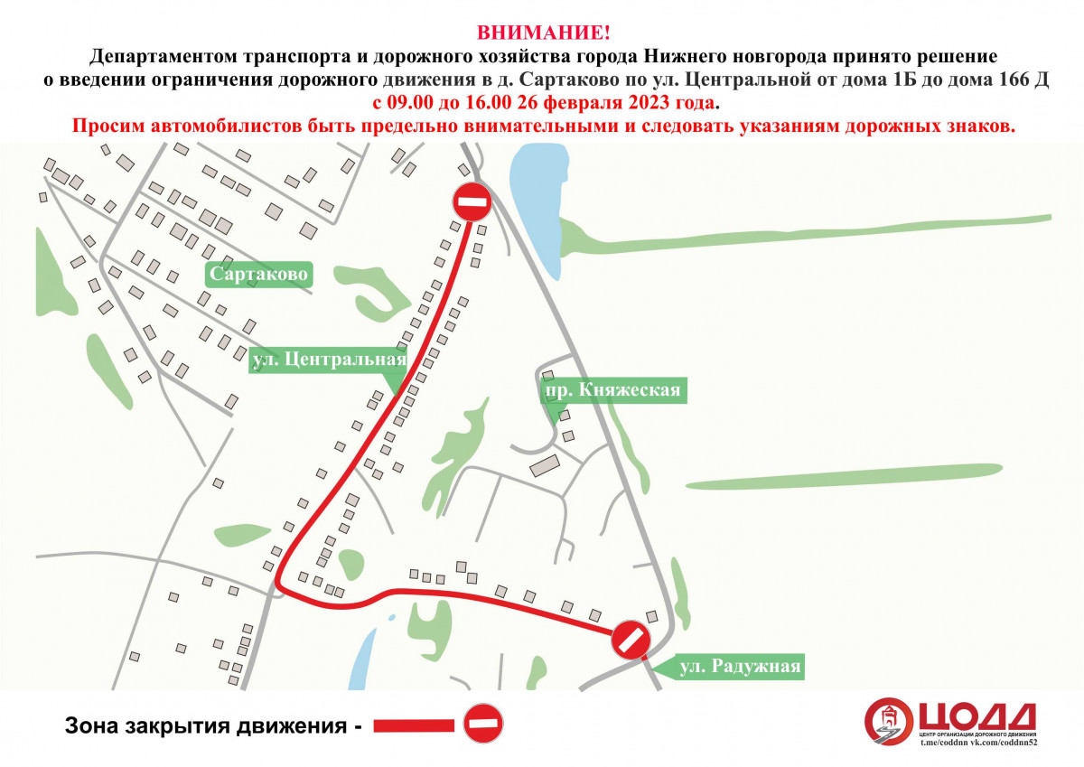 С 9:00 до 16:00 26 февраля автотранспорт не сможет проехать от дома № 1 «б» до дома № 166 «д» по улице Центральной в деревне Сартаково. Кроме того, на этом участке временно запретят парковать автомобили. ограничения связаны с празднованием Масленницы.