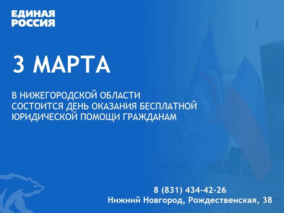 День оказания бесплатной юридической помощи гражданам состоится на площадке региональной общественной приемной партии «Единая Россия» (ул. Рождественская, 38) 3 марта. Об этом сообщает пресс-служба РИК НРО «ЕР».
