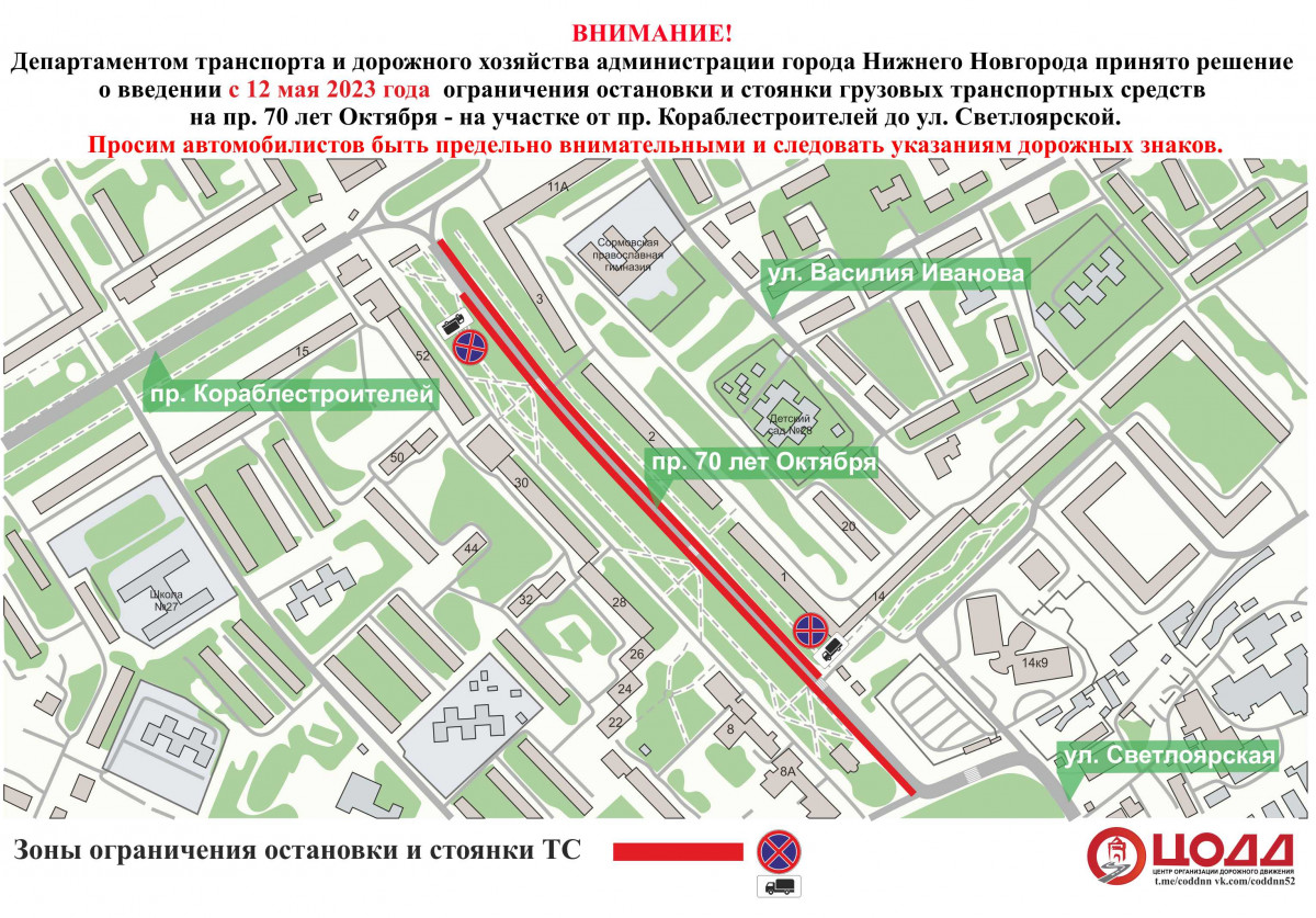 Ограничения на остановку и стоянку грузового транспорта введут на участке проспекта 70 лет Октября (от проспекта Кораблестроителей до улицы Светлоярской) с 12 мая, сообщили в департаменте транспорта и дорожного хозяйства администрации Нижнего Новгорода.