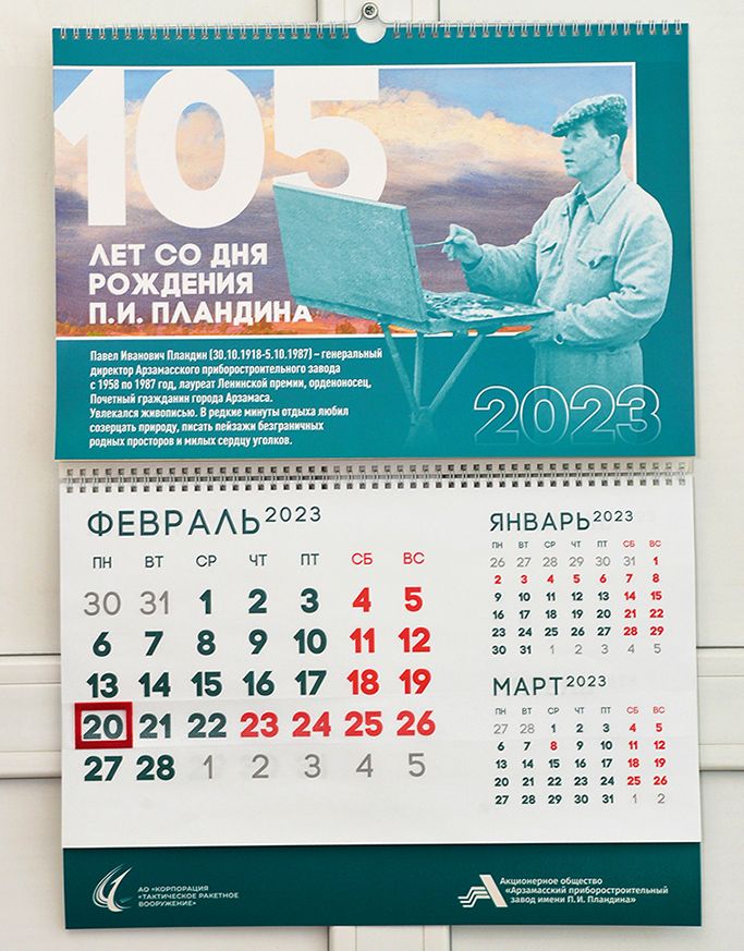 Корпоративный календарь АО «АПЗ», посвященный 105-летию со дня рождения П. И. Пландина, признан лучшим в своих номинациях сразу в двух престижных конкурсах — «Серебряные нити» и «Корпоративный календарь».