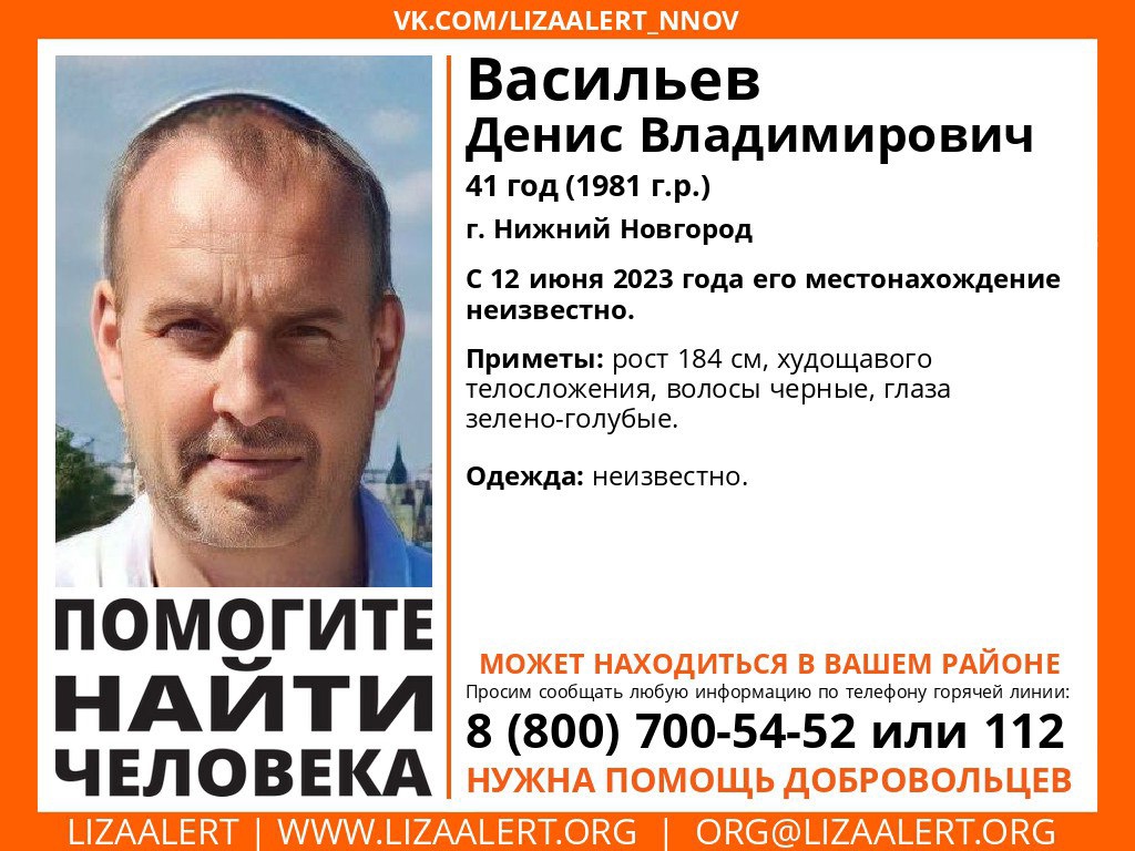 41-летнего Дениса Васильева разыскивают в Нижнем Новгороде, сообщает поисковый отряд «ЛизаАлерт» на своей странице в сети «ВКонтакте».