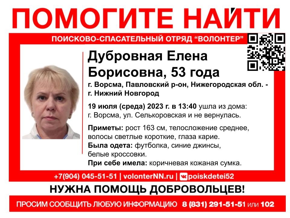 53-летняя Елена Дубровная пропала в Ворсме, сообщает ПСО «Волонтер НН» во «ВКонтакте».
