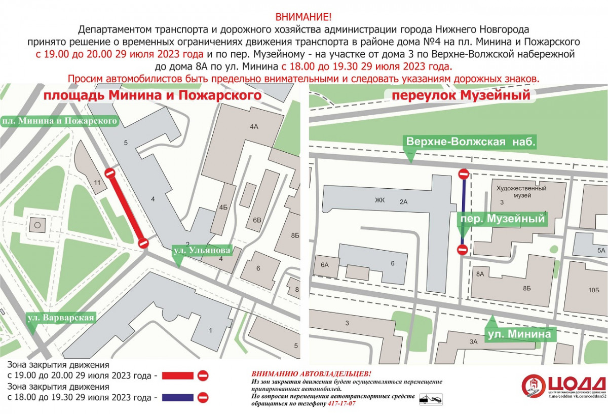 А с 18:00 до 19:30 29 июля ограничат движение на участке переулка Музейного — от дома №3 по улице Верхне-Волжская набережная до дома №8А по улице Минина.