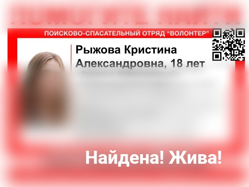 18-летняя Кристина Рыжова, пропавшая в Дзержинске, найдена живой. Об этом сообщается на странице ПСО «Волонтер НН» во «ВКонтакте».