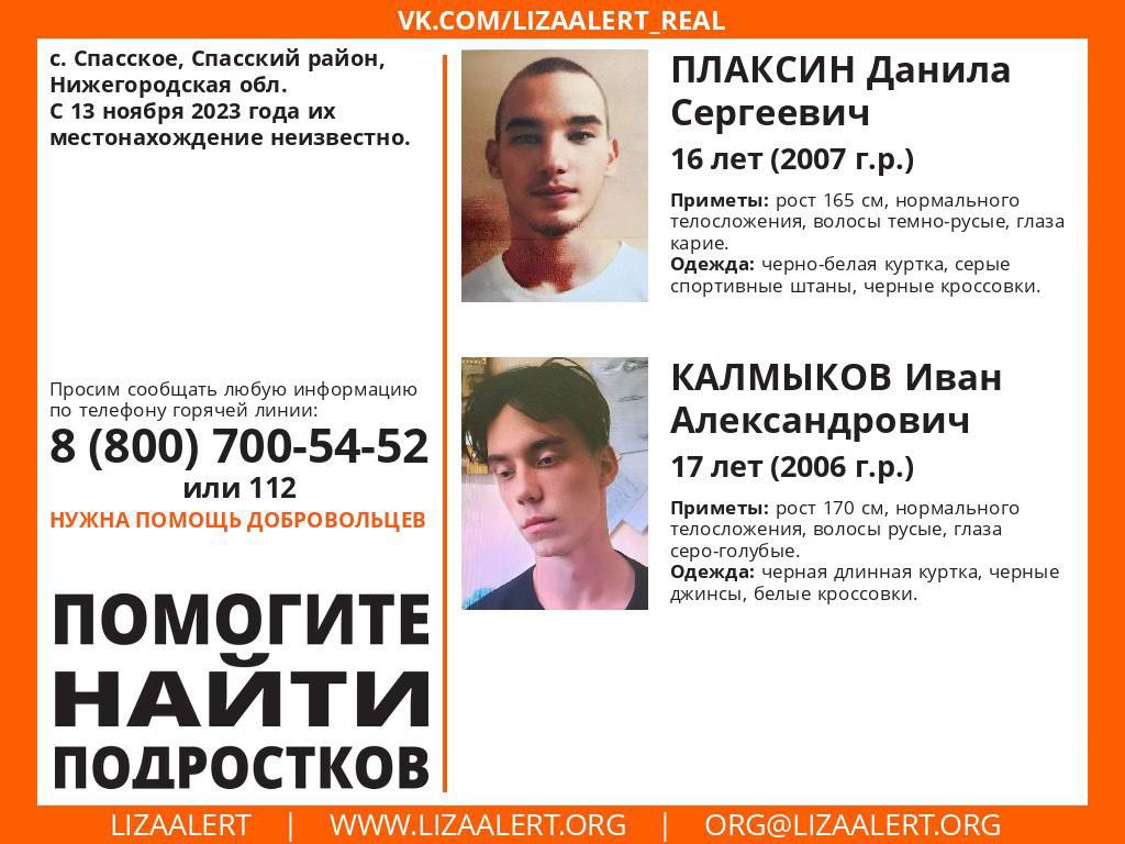 Два подростка пропали 13 ноября. У 16-летнего Данилы Плаксина рост 165 см, нормальное телосложение, темно-русые волосы и карие глаза. Он был одет в черно-белую куртку, серые спортивные штаны и черные кроссовки. 17-летний Иван Калмыков ростом 170 см с русыми волосами и серо-голубыми глазами. На нем была черная длинная куртка, черные джинсы и белые кроссовки.