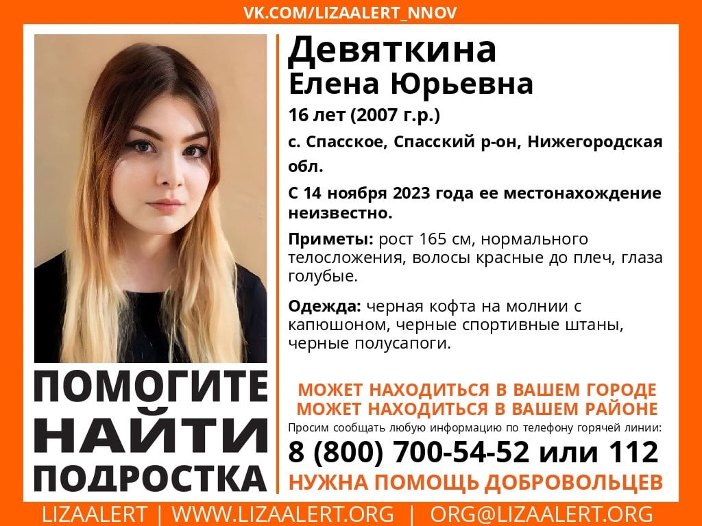 14 ноября пропала 16-летняя Елена Девяткина. Приметы девушки — рост 165 см, нормальное телосложение, красные волосы до плеч и голубые глаза. Она была одета в черную кофту на молнии с капюшоном, черные спортивные штаны и черные полусапоги.