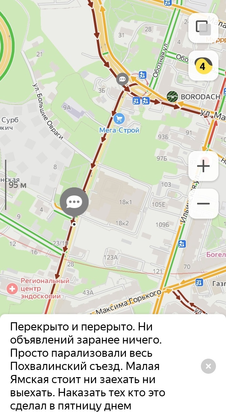 «Перекрыто и перерыто. Просто парализовали весь Похвалинский съезд. Малая Ямская стоит — ни заехать, ни выехать», — написал в комментариях на «Яндекс.Картах» один из пользователей.