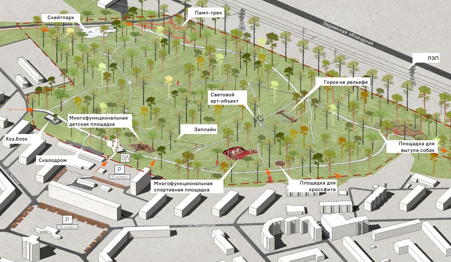 Всего проект создания парка «Молодежный» предусматривает поэтапное строительство на этой территории более десяти различных площадок для отдыха и занятий спортом. Это детская площадка, скейт-парк и памп-трек, зиплайн и горки, площадка для выгула собак, а также зоны спокойного отдыха и арт-объекты. На территории парка появятся дорожно-тропиночная сеть с твердым покрытием, урны для сбора мусора, скамейки, освещение и система видеонаблюдения.