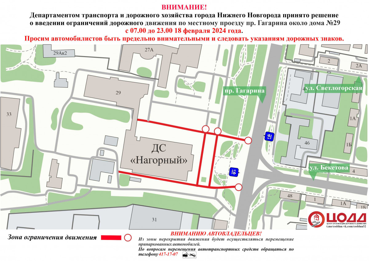 С 07:00 до 23:00 18 февраля будет ограничено движение транспорта по местному проезду проспекта Гагарина — на участке около дома №29, сообщили в департаменте транспорта и дорожного хозяйства администрации Нижнего Новгорода.