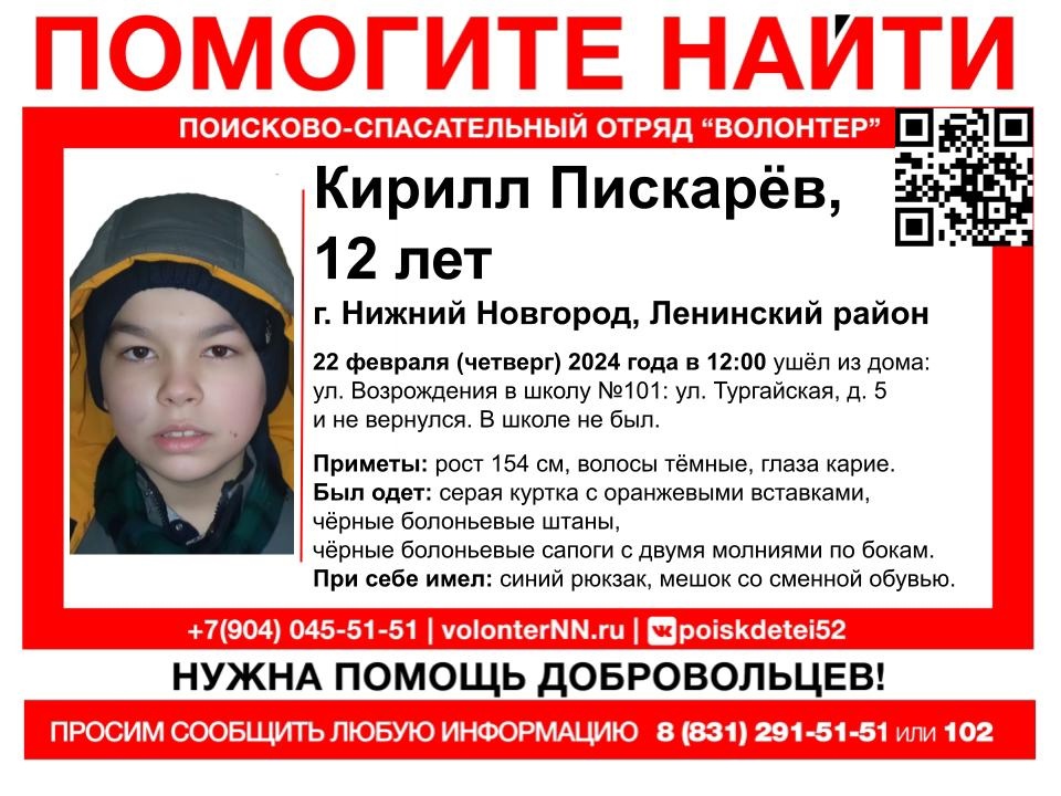 12-летнего Кирилла Пискарёва ищут в Нижнем Новгороде