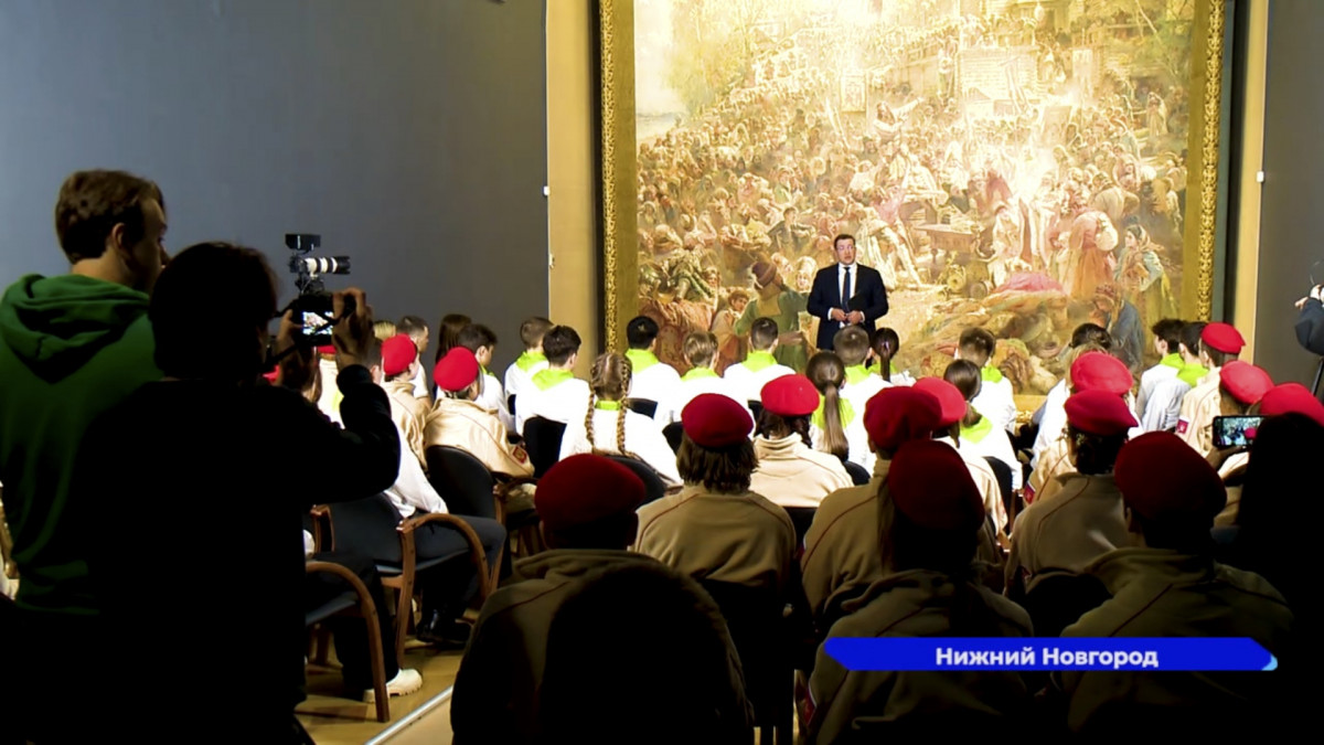 Урок состоялся (0+) в зале с картиной «Воззвание Минина». Детям рассказали про ополчение, подвиг Минина и Пожарского, Нижегородскую ярмарку и историю Нижегородской губернии.