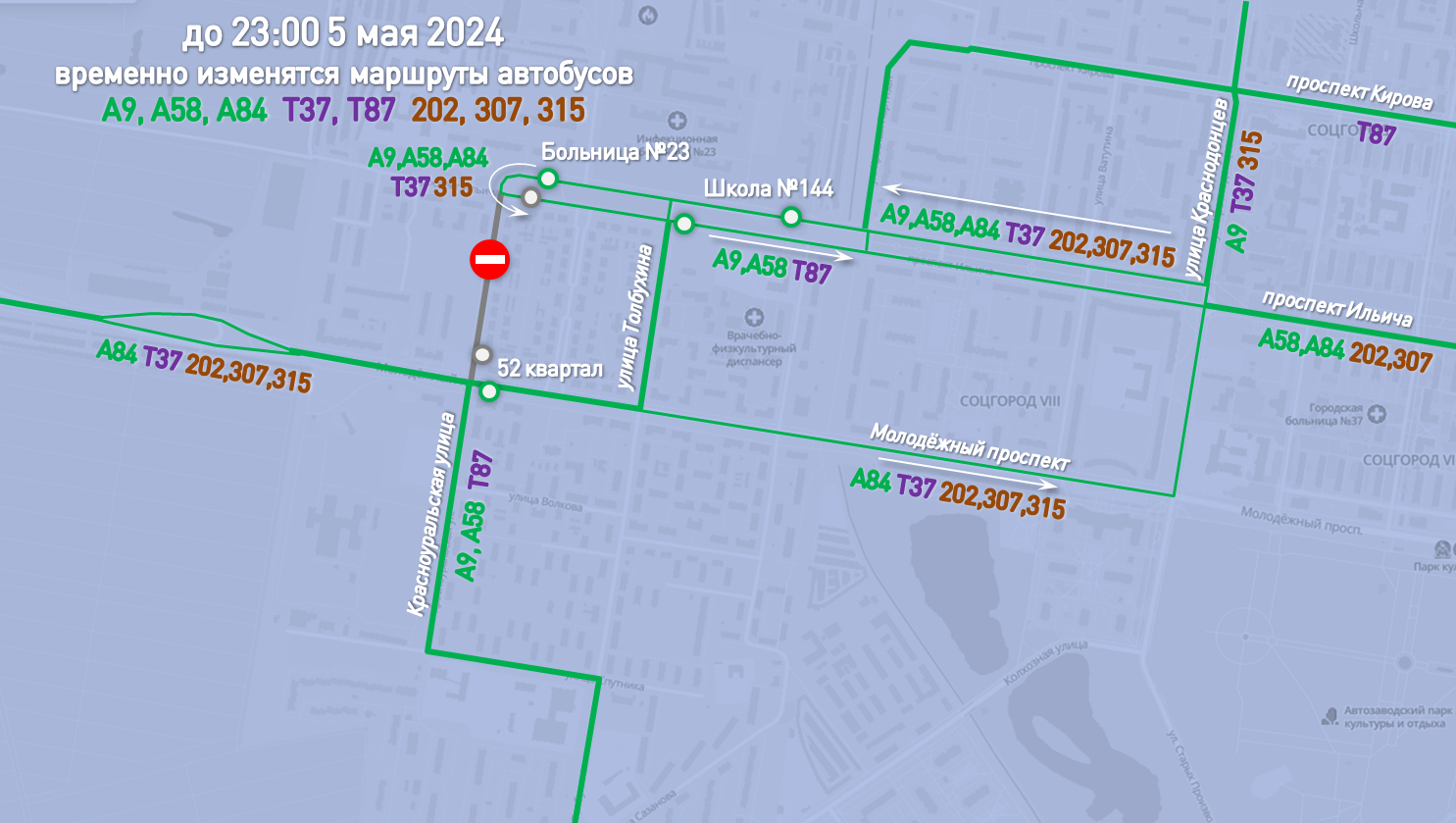 Автобусные маршруты А-9, А-58, Т-87 будут курсировать в направлении улицы Космической — по проспекту Ильича, с разворотом на пересечении с улицей Красноуральской, по улице Толбухина, Молодежному проспекту, улице Красноуральской. В направлении улицы Краснодонцев — по Молодежному проспекту, улице Толбухина, проспекту Ильича.