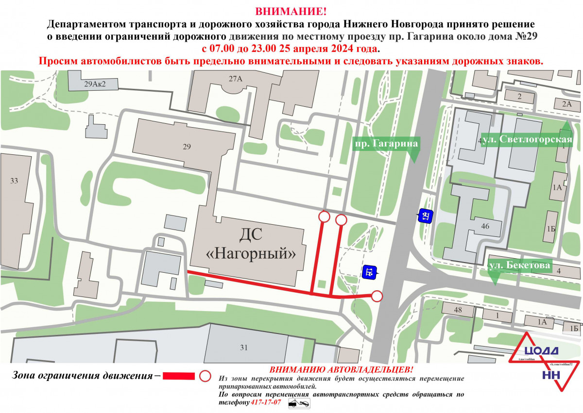 С 07:00 до 23:00 25 апреля будет прекращено движение транспорта по местному проезду проспекта Гагарина — на участке около дома № 29, сообщили в департаменте транспорта и дорожного хозяйства администрации Нижнего Новгорода.