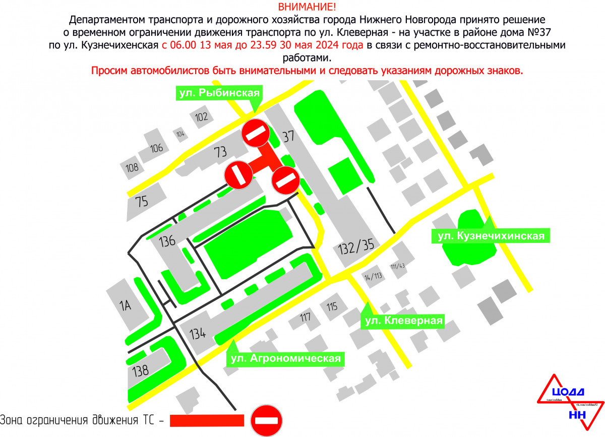 С 06:00 13 мая до 23:59 30 мая в связи с ремонтно-восстановительными работами на инженерных сетях будет прекращено движение транспорта в районе дома № 37 по улице Клеверной, сообщили в департаменте транспорта и дорожного хозяйства администрации Нижнего Новгорода.