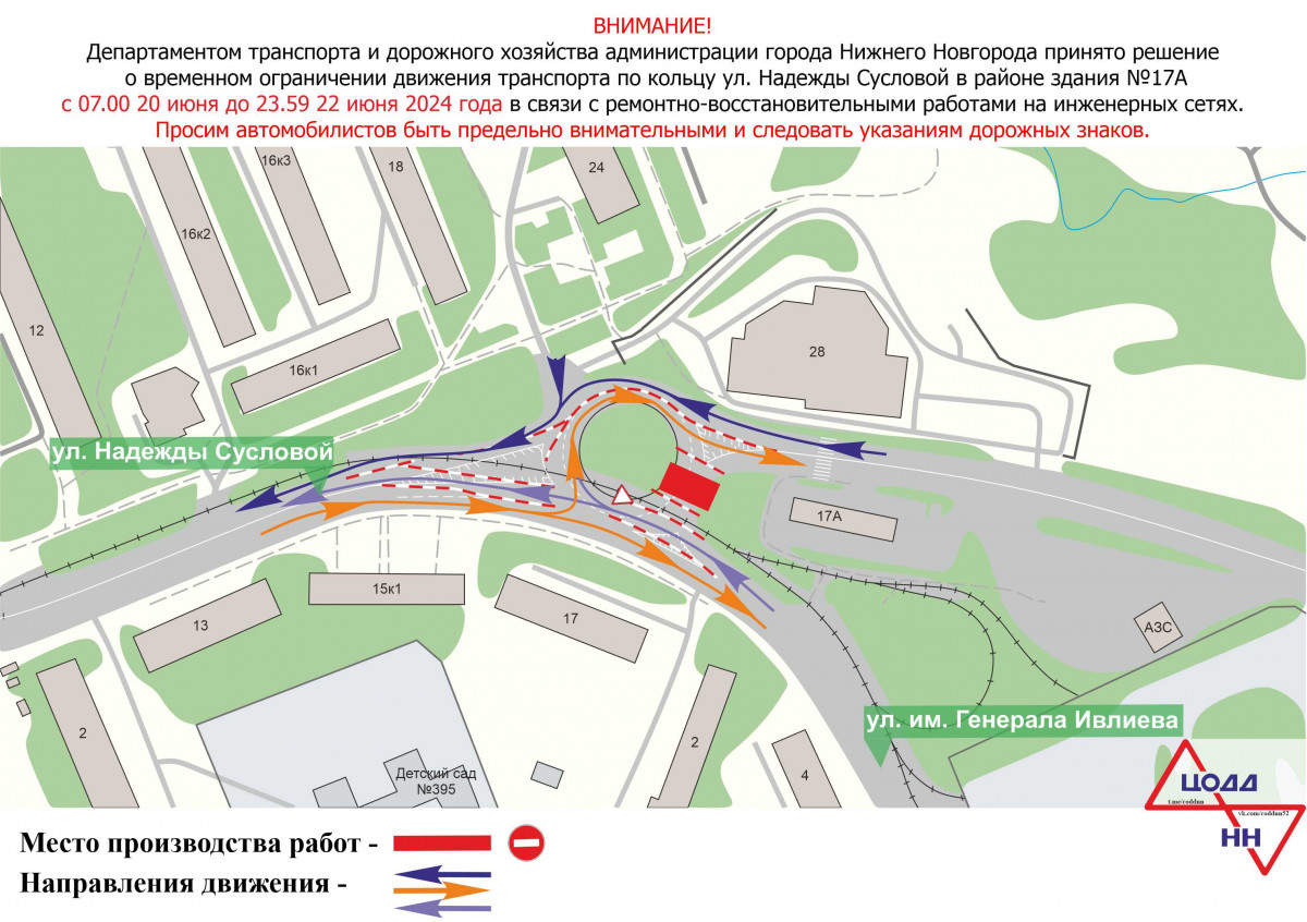 С 07:00 20 июня до 23:59 22 июня в связи с ремонтно-восстановительными работами на инженерных сетях будет прекращено движение транспорта по кольцу улицы Надежды Сусловой — в районе здания № 17А по улице Надежды Сусловой, сообщили в департаменте транспорта и дорожного хозяйства администрации Нижнего Новгорода.