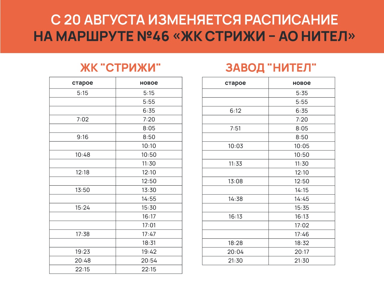 Расписание маршрута №46 «ЖК «Стрижи» — АО «Нител» изменится в Нижнем Новгороде с 20 августа, сообщается в группе «Новая маршрутная сеть Нижегородской агломерации» в социальной сети.
