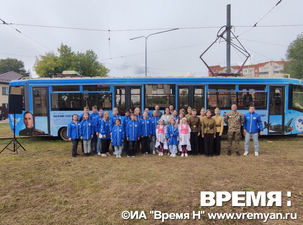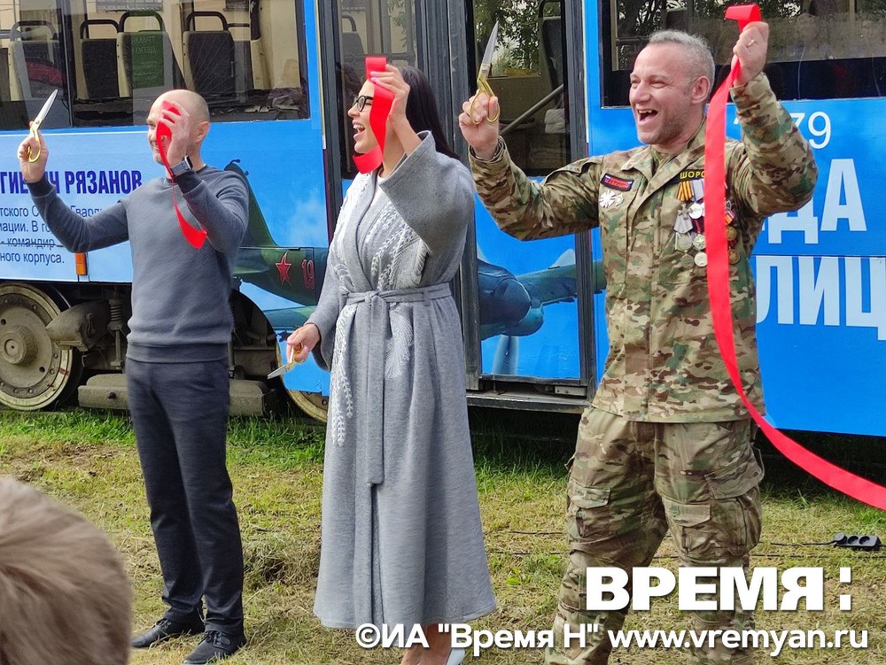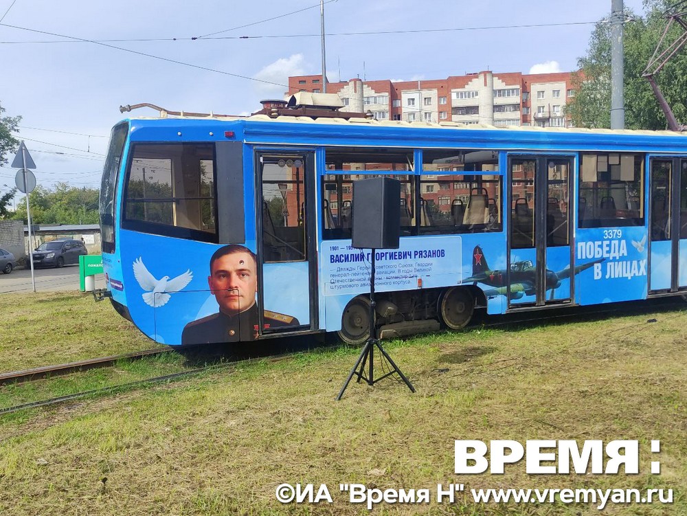 Новый трамвай посвящен вкладу в Победу в Великой Отечественной войне четырех нижегородцев — Героев Советского Союза: Николая Фильченкова, Евгения Никонова, Василия Рязанова и Арсения Ворожейкина. Их портретами украшен вагон.