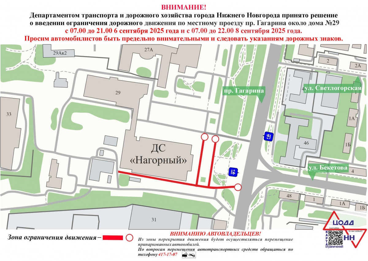 Движение транспорта ограничат в районе дома № 29 по проспекту Гагарина в Нижнем Новгороде с 07:00 до 21:00 6 сентября и с 07:00 до 22:00 8 сентября, об этом сообщает пресс-служба администрации Нижнего Новгорода.