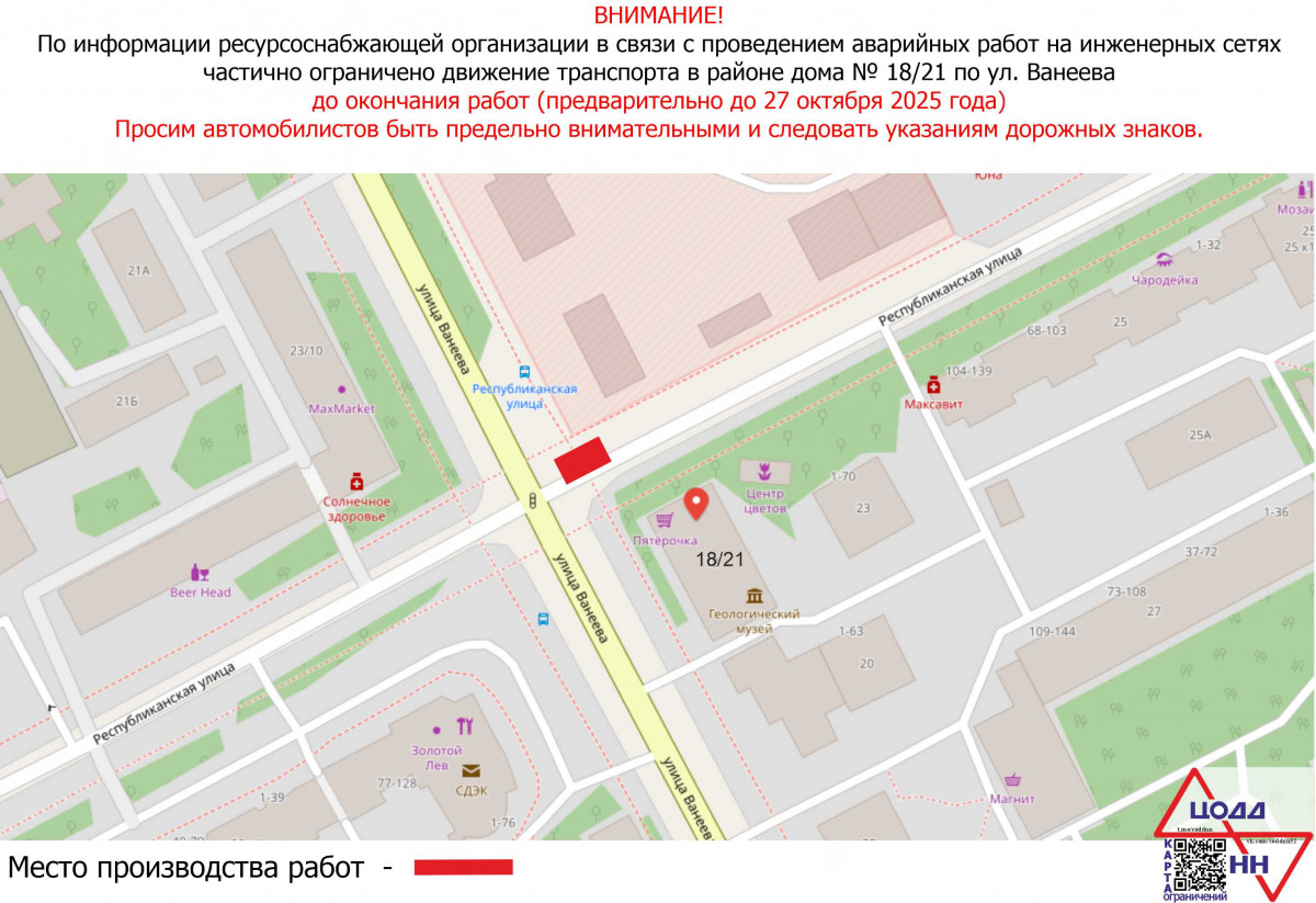 В Нижнем Новгороде до окончания аварийных работ на инженерных сетях полностью ограничено движение транспорта в районе дома №18/21 по улице Ванеева. Об этом сообщает пресс-служба городской администрации.