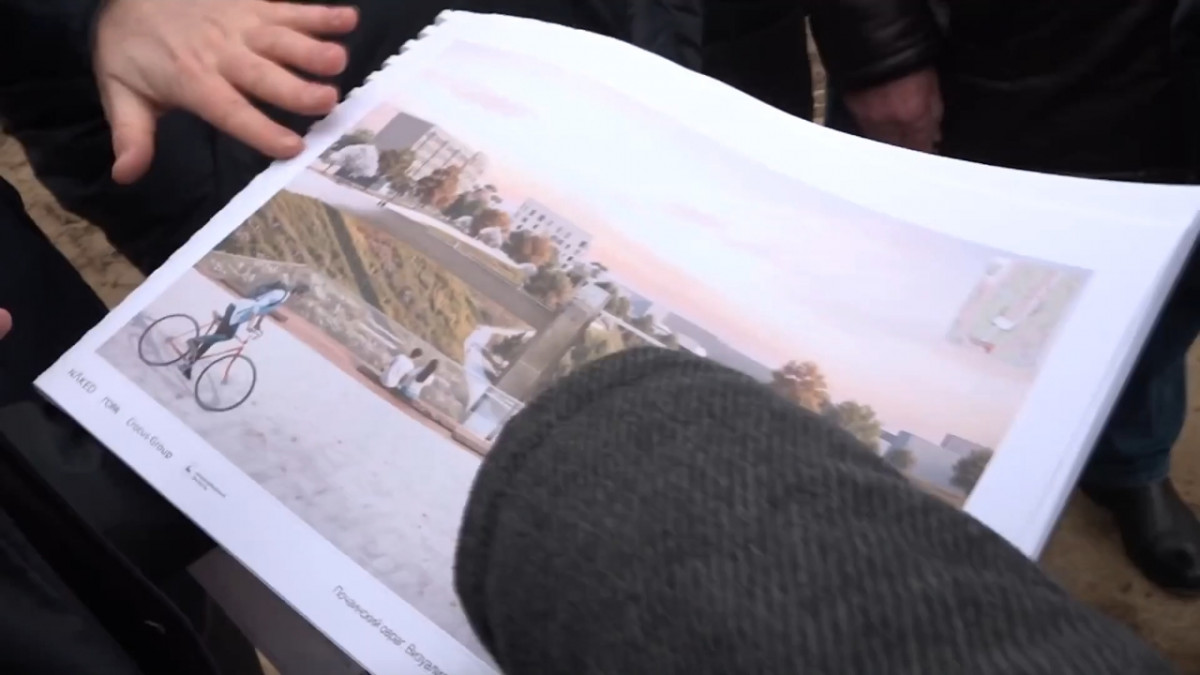 Участники встречи начали осмотр со строительного городка в районе дома №1 Университетского переулка. Отсюда с обзорной площадки можно увидеть всю территорию будущих изменений. Завершился осмотр около Лыковой Дамбы. Здесь будет современный террасный парк.