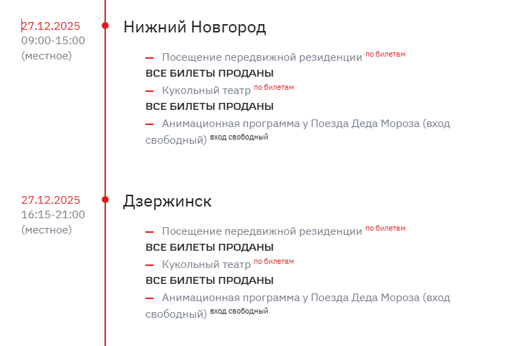 Все билеты в передвижную резиденцию Деда Мороза и кукольный театр в Нижнем Новгороде и Дзержинске раскупили в первый же день их продажи сегодня, 27 ноября. Данные опубликованы на странице «РЖД».
