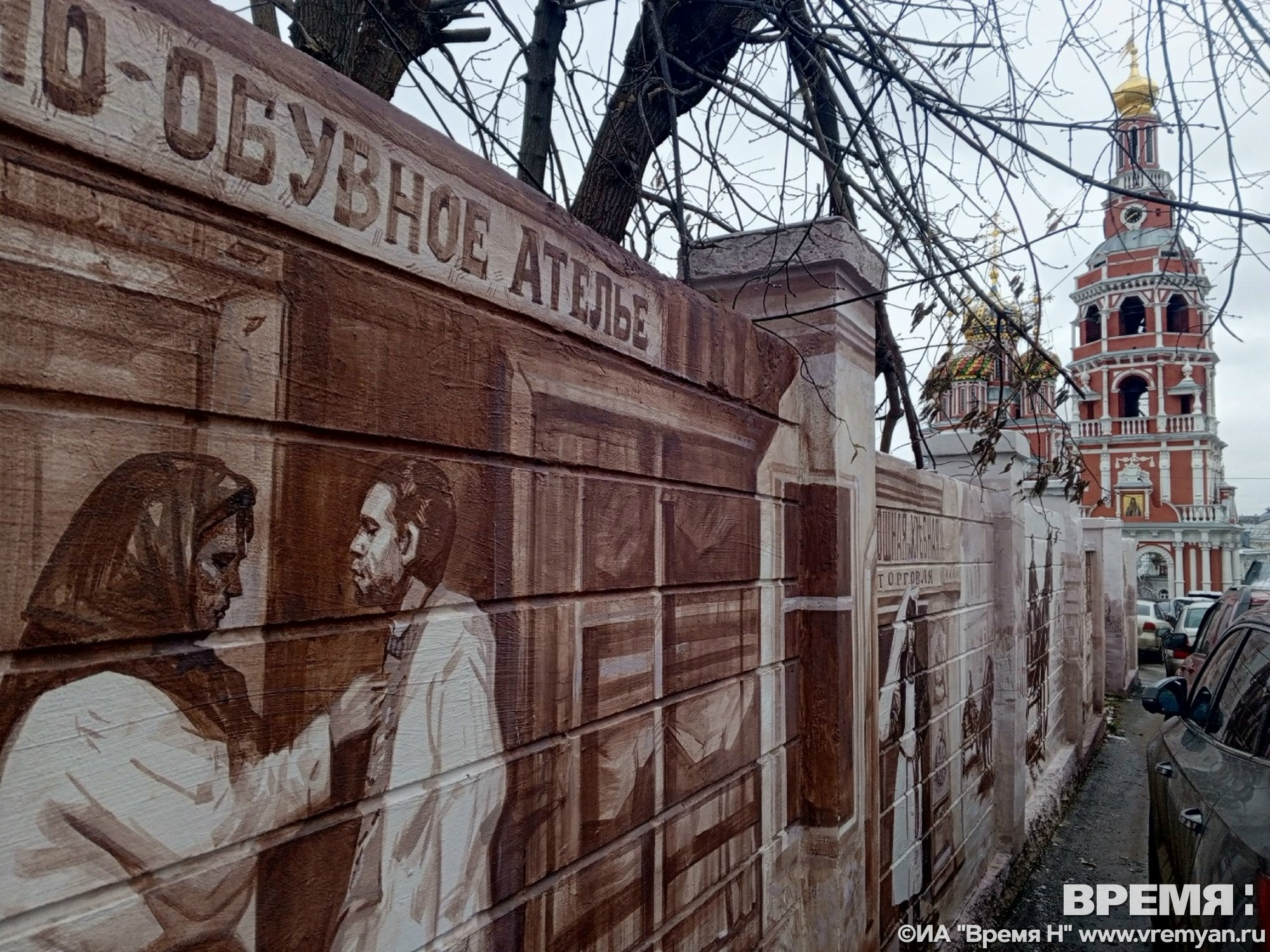 Быт людей 19-го — начала 20 века отразили художники на заборе рядом со Строгановской (Рождественской) церковью в Нижнем Новгороде. ИА «Время Н» публикует фото с места событий.