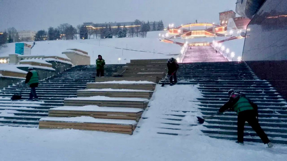 В Нижнем Новгороде работает 360 единиц техники, 1 425 дорожных рабочих и дворников — они заняты на уборке снега, который шел весь день 31 декабря.