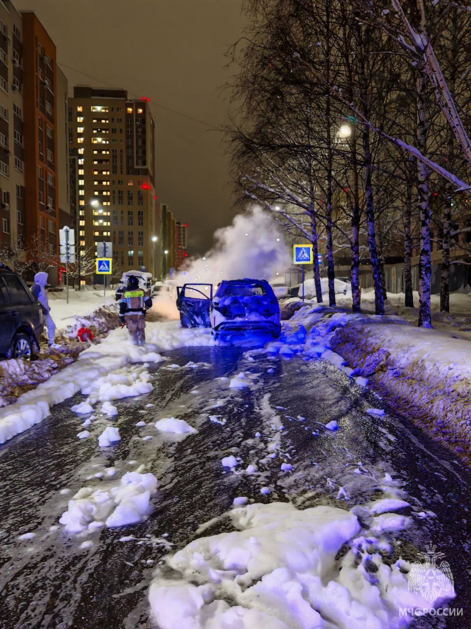 Автомобиль загорелся сегодня утром в ЖК «Новая Кузнечиха». Фотографиями с места происшествия поделились в пресс-службе ГУ МЧС России по Нижегородской области.