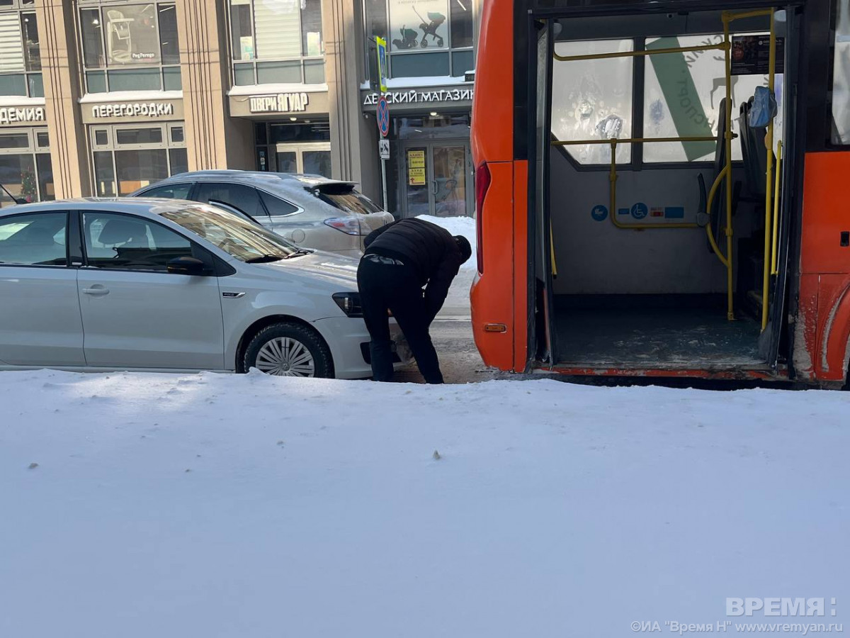 Автомобиль «Фольксваген» врезался во впереди идущий автобус на улице Горького в Нижнем Новгороде 2 февраля. Об этом ИА «Время Н» сообщили очевидцы происшествия.