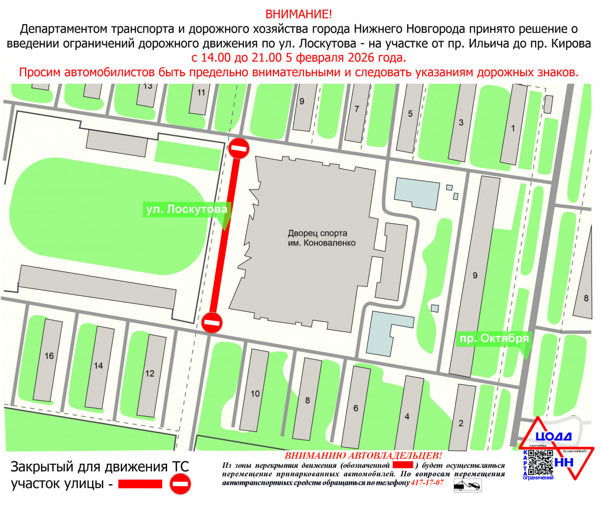 С 14:00 до 21:00 5 февраля будет ограничено движение транспорта по улице Лоскутова — от проспекта Ильича до проспекта Кирова — в связи с проведением хоккейных матчей. Объезд будет организован по прилегающим улицам. Об этом сообщает пресс-служба администрации Нижнего Новгорода.