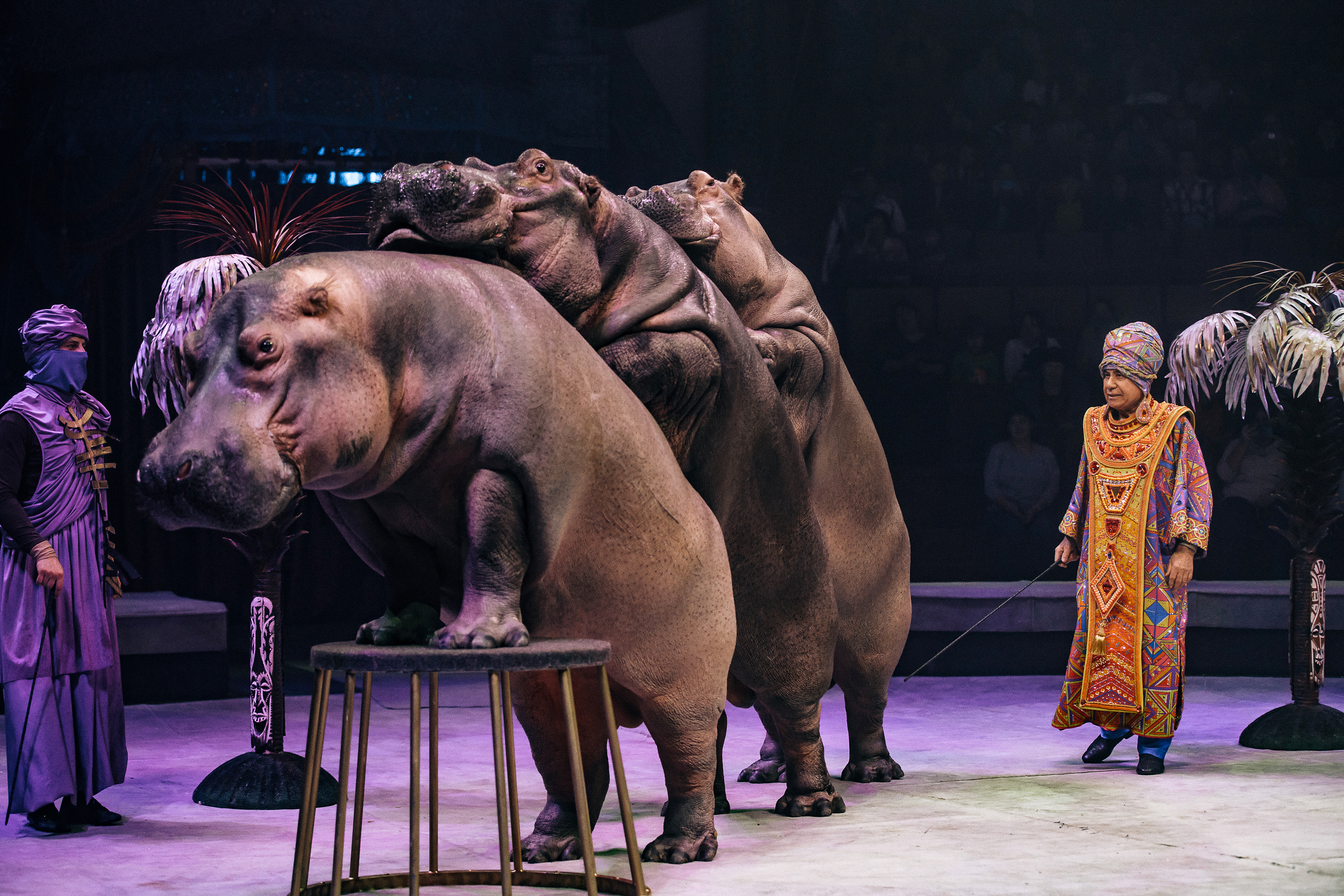 В шоу «Песчаная сказка», как и во всех проектах Заслуженного артиста РФ Гии Эрадзе, отдельное внимание уделено номерам с животными. Изюминка этого шоу — аттракцион с обезьянами и тремя бегемотами под руководством Народного артиста РФ Тофика Ахундова. Только представьте: полуторатонные тяжеловесы исполнят невероятные трюки на расстоянии вытянутой руки от зрителей, восхитив даже самую искушенную публику!