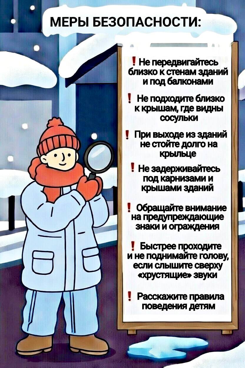 Категорически нельзя выходить на крыши для очистки снега, сбивать сосульки и снег с балконов, карнизов или козырьков, игнорировать предупреждающие знаки и ограждения.